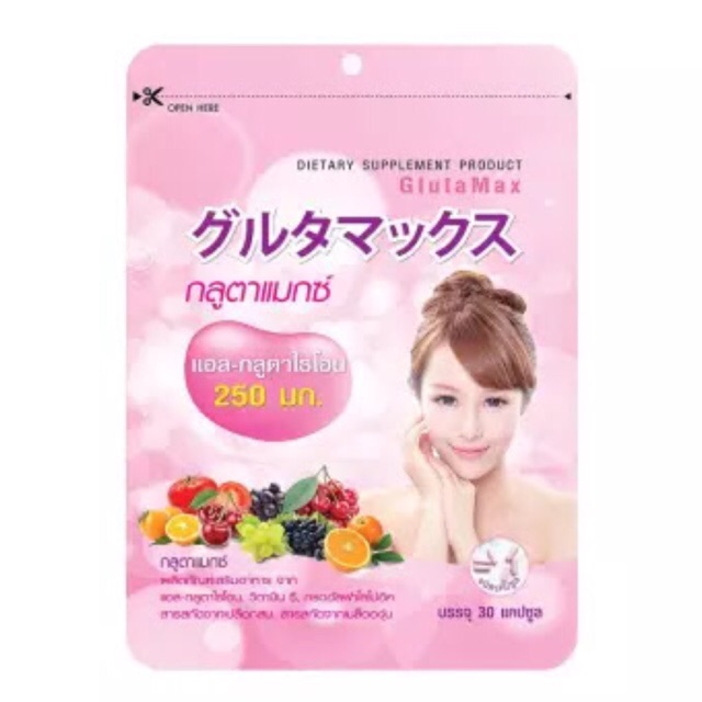 พร้อมส่ง Glutamax Dietary Supplement กลูตาแมกซ์ (กลูต้าแมกซ์) 30แคปซูล กลูตาแมกซ์ ผลิตภัณฑ์เสริมอาหาร 30 เม็ด แบรนด์ : Glutamax ปริมาณ : 27กรัม เลขที่ อย. : 10-1-06453-1-0035 รายละเอียด กลูต้าคุณภาพดีจากญี่ปุ่น พร้อมวิตามินจากสารสกัดจากผักผลไม้มากมาก เช่น มะเขือเทศเข้มข้น, ส้ม, อะเซโรล่า เชอร์รี่, เปลือกสน, เมล็ดองุ่น, ซิงค์ และ ฯลฯ ส่วนประกอบใน 1 แคปซูล • แอล-กลูตาไธโอน (L-Glutathione) 250 มก. • แอสคอร์บิค แอซิด (Ascorbic Acid) 50 มก. • อัลฟา ไลโปอิค แอซิด (Alpha Lipoic Acid) 50 มก. • สารสกัดจากส้ม (Citrus Sinensis Extract) 30 มก. • สารสกัดจากอะเซโรล่า เชอรี่ (Acerola Cherry Extract) 20 มก. • สารสกัดจากมะเขือเทศ (Tomato Extract) 100 มก. • สารสกัดจากเปลือกสน (Pine Bark Extract) 30 มก. • สารสกัดจากเมล็ดองุ่น (Grape Seed Extract) 30 มก. • ซิงค์อะมิโนคีเลต 20% (Zinc Amino Acid Chelate 20%) 20 มก. วิธีรับประทาน รับประทานวันละ 2 เม็ดก่อนนอน บำรุงเร่งด่วน วันละ 4 เม็ด ก่อนนอน วิธีการเก็บรักษา เก็บไว้ในที่แห้งอุณหภูมิไม่เกิน 30 องศา และป้องกันแสงแดด คำเตือน 1. กรุณาอ่านคำเตือนในฉลากก่อนบริโภค 2. เด็ก, สตรีมีครรภ์ และสตรีให้นมบุตร ไม่ควรรับประทาน 3. ผลิตภัณฑ์นี้เป็นผลิตภัณฑ์เสริมอาหาร ไม่มีผลในการป้องกันและรักษาโรค ผลลัพธ์ไม่สามารถเกิดขึ้นกับผู้ใช้ทุกคน อาจมีผลกับแต่ละบุคคลเท่านั้น 4. การได้รับสารอาหารนั้นควรได้จากการบริโภคอาหารหลักครบ 5 หมู่ ในสัดส่วนที่เหมาะสมเป็นประจำ กลูตาแมกซ์ GlutaMax ผิวขาว gluta กลูต้า กลูตาไธโอน กลูต้าไธโอน กลูต้าแม็กซ์